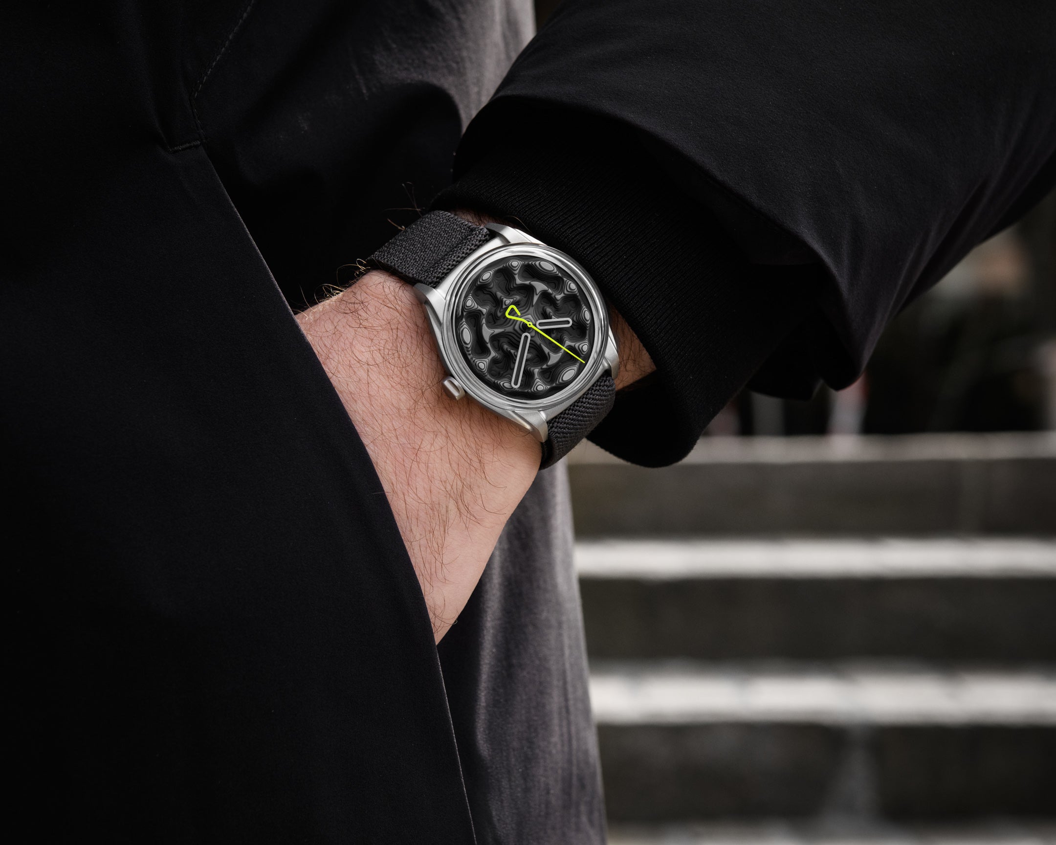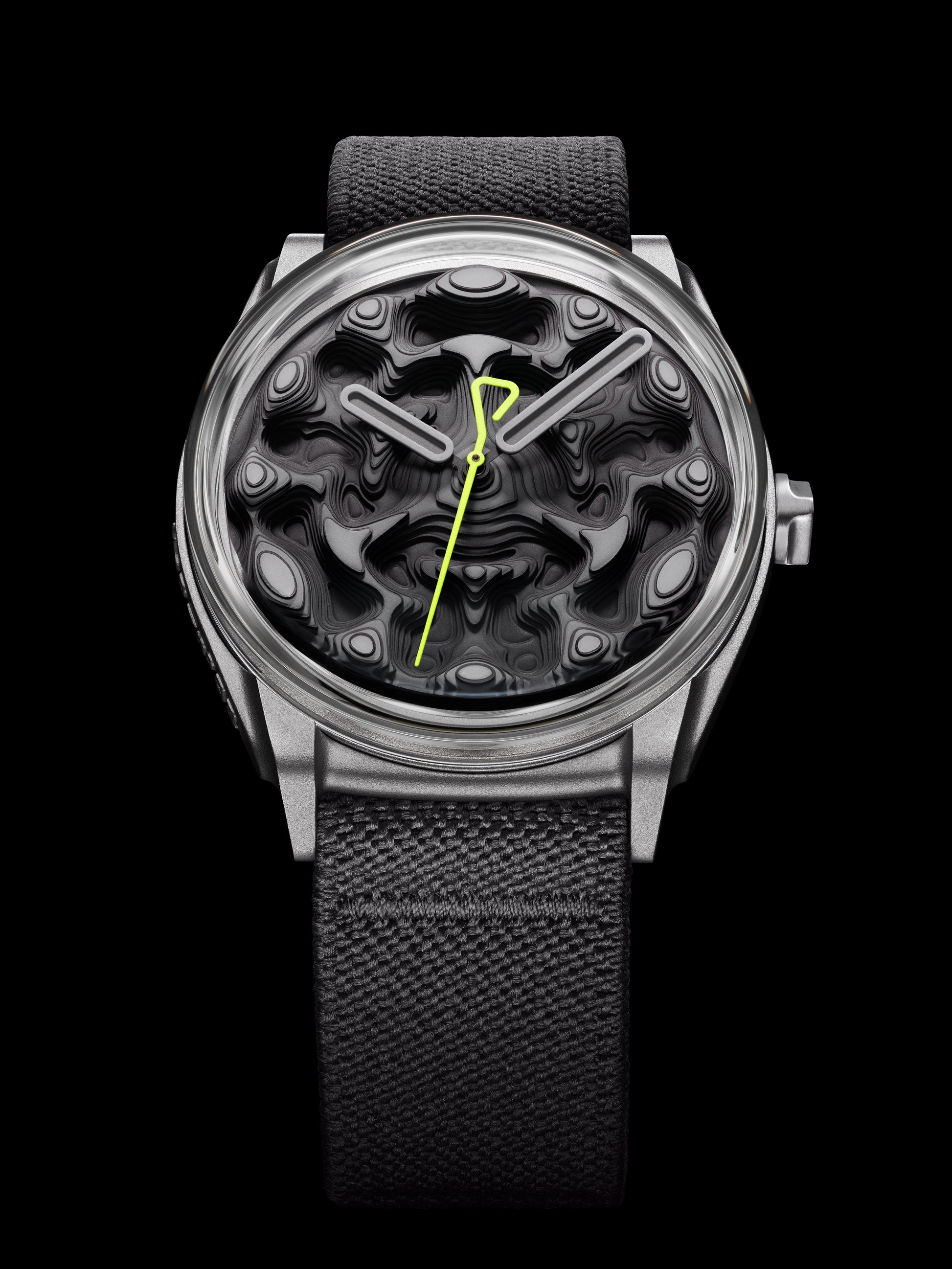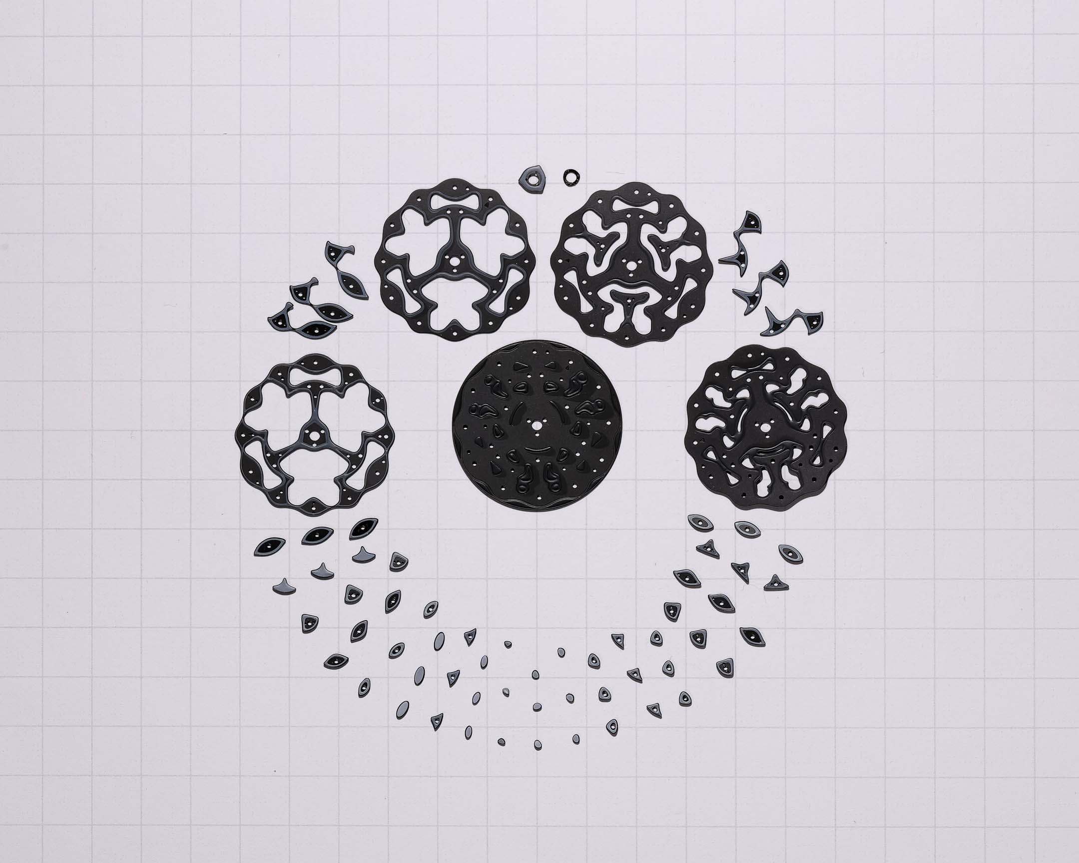 Across nine layers consisting of sixty-seven individual dial plates (with pegs and all), Projekt 02 Variant B brings back the much-loved color scheme of Projekt 01 Variant E (and a certain OG colorway of an emblematic sneaker from ’95) and ups the drama. With a vertical gradient shifting from light grey at the peaks to near-black in the dial’s lowest crevasses, Projekt 02 Variant B gives the term “depth” when describing dials a truly literal sense.