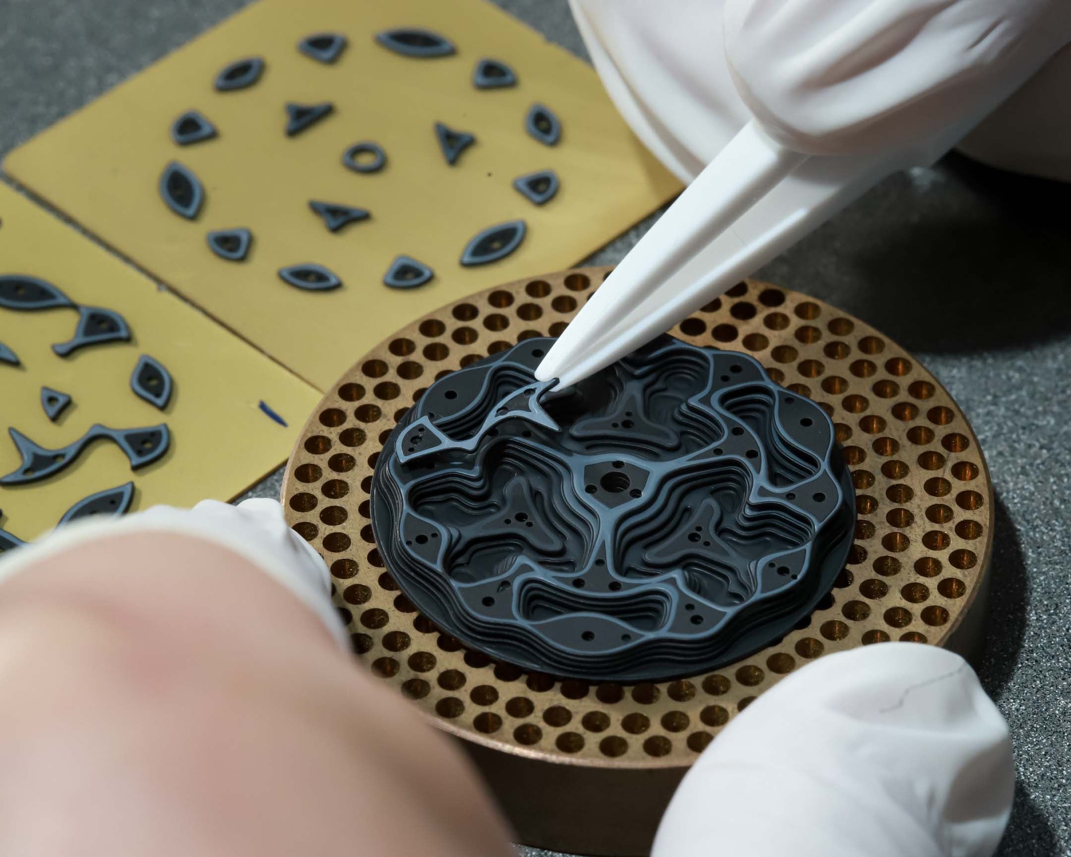 Projekt 02’s topographical dial is made in nine layers, composed of sixty-seven individual dial plates, which are individually hand-painted with a mix of lacquer and Super-Luminova, carefully avoiding the metal contours. These plates are then vertically stacked and pegged on top of each other, one at a time. It takes around 6 hours to assemble a single dial, and the plates can be prone to bending when pressed together, causing the entire dial to have to be discarded and the work starts all over again. Oh, the poor dial-makers…
