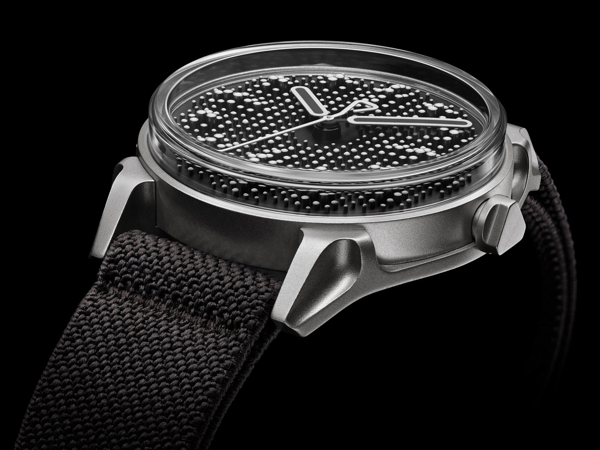 A work of transhumanism. Lo-fi yet three-dimensional. Is it one of those pin art boards from the 80s? A graphical representation of a ripple? A miniature cityscape? The dial is actually a 3D reconstruction of an intentionally pixelated image rendered by Adobe Illustrator. If you squint your eyes, you can clearly make out 12 “maxi” hour markers, with batons for the cardinal hours and circles for the others.