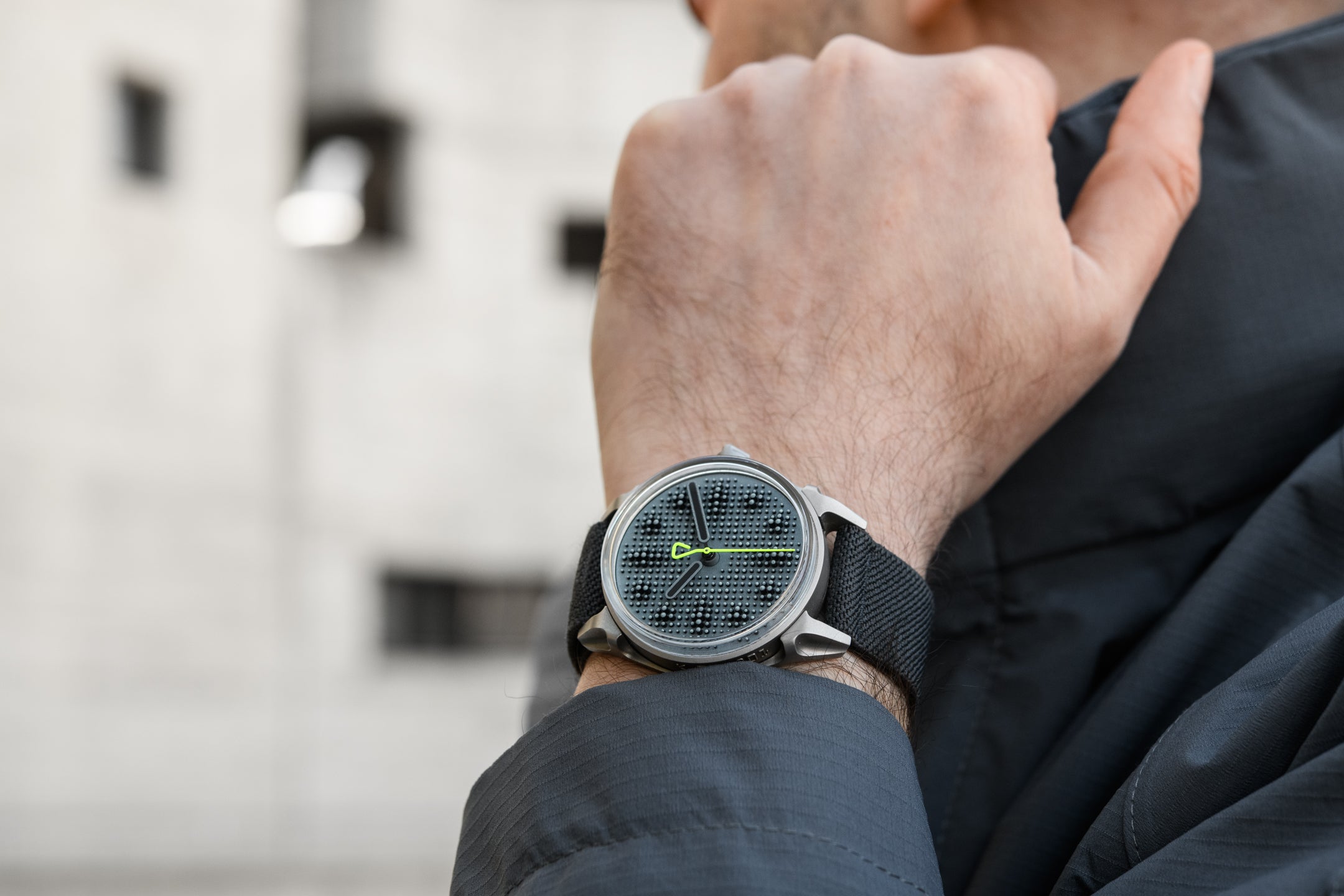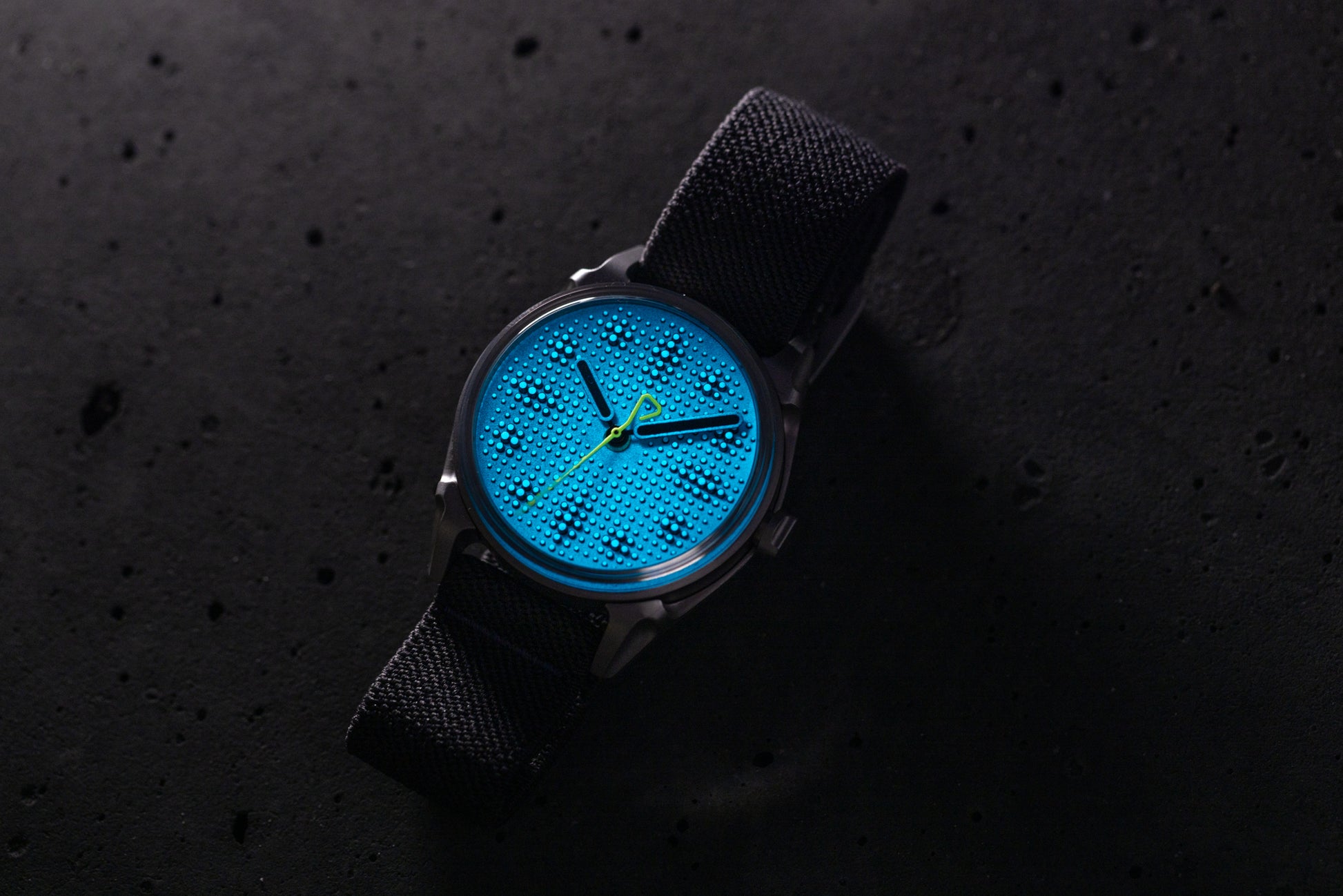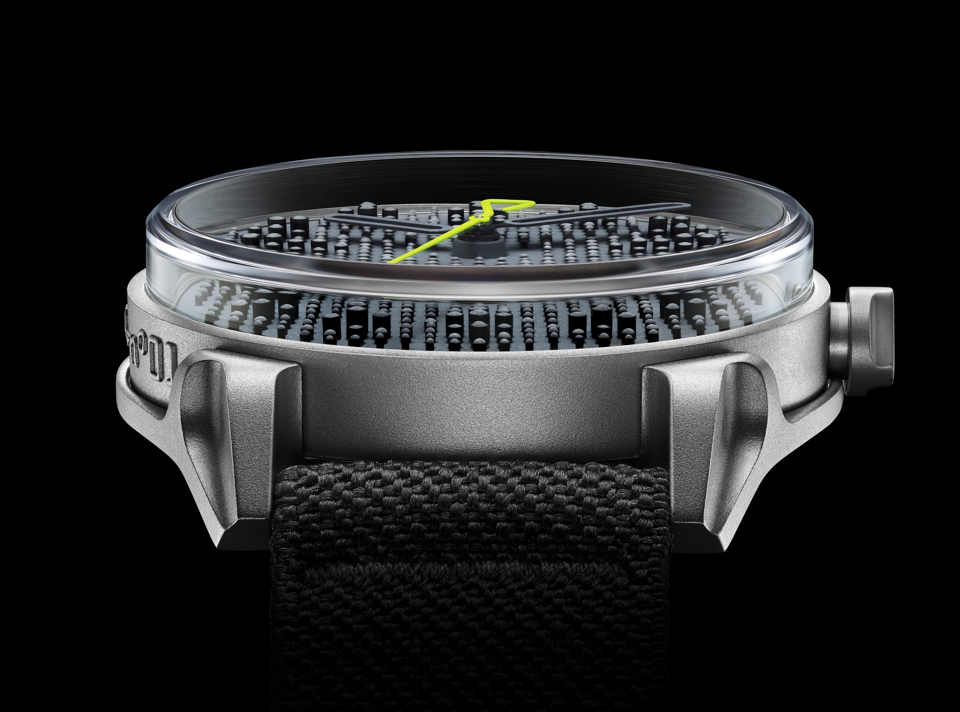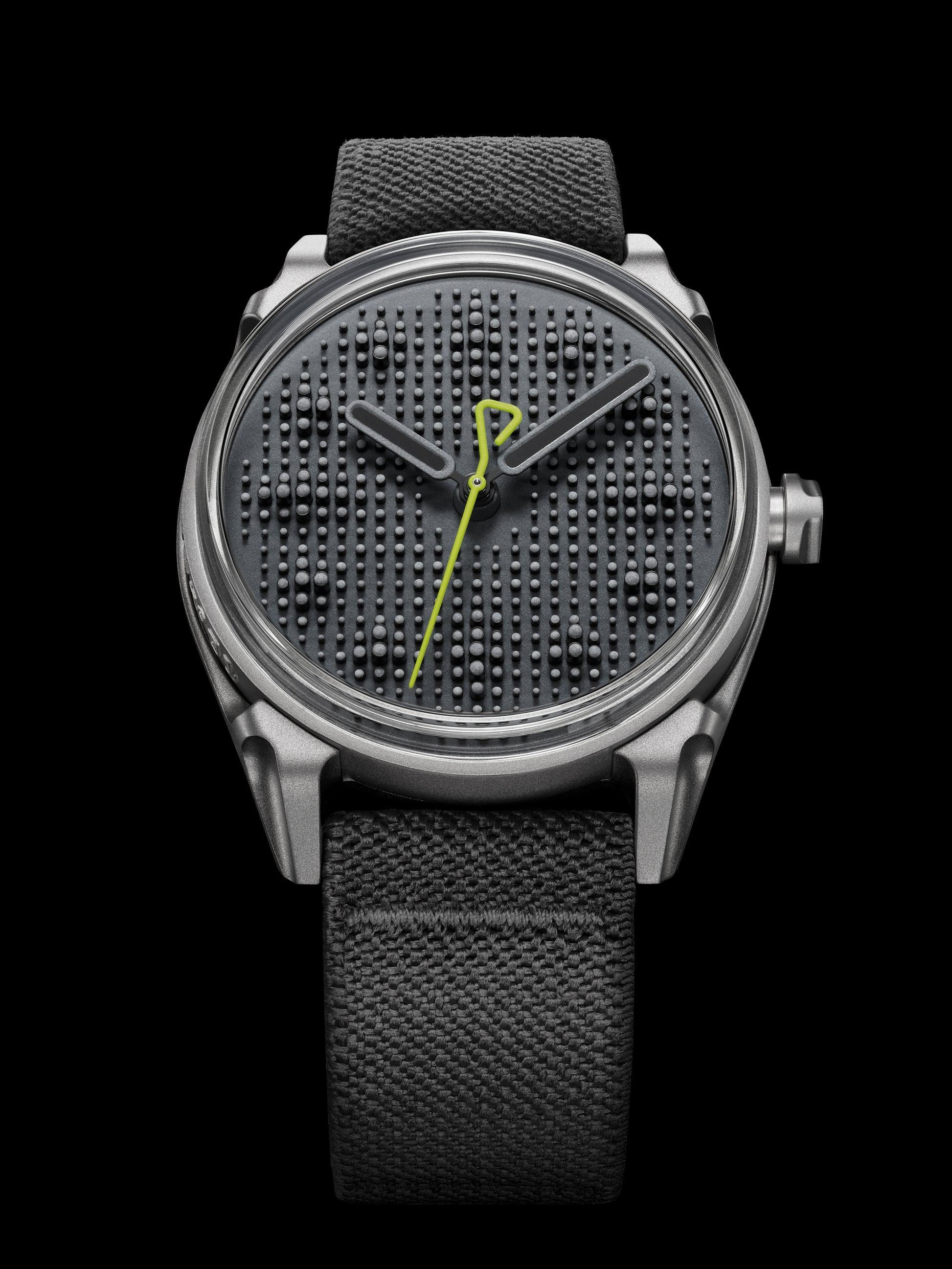 Without trying hard to be outlandish for edginess’ sake, the case is literally crafted like no other watch out there. Forged from 316L stainless steel, the case is not made using typical milling and machining processes at all, though the process is in fact industrial and rather old-school: die casting steel. Why? Well, because they said it couldn’t be done. And because the desired result was one where the case would boast practically no finishing or embellishment, and instead feature a uniform, industrial heavy duty steel tool-like appearance with a specific texture that can only be produced when injecting molten steel into a cast form. It’s neither matte nor frosty, but somewhere in between. And as rough as it looks, it’s unexpectedly soft to the touch. Because of the die-casting process, the edges and angles are slightly rounded off, while the steel has a surface that is neither entirely matte nor sparkly.