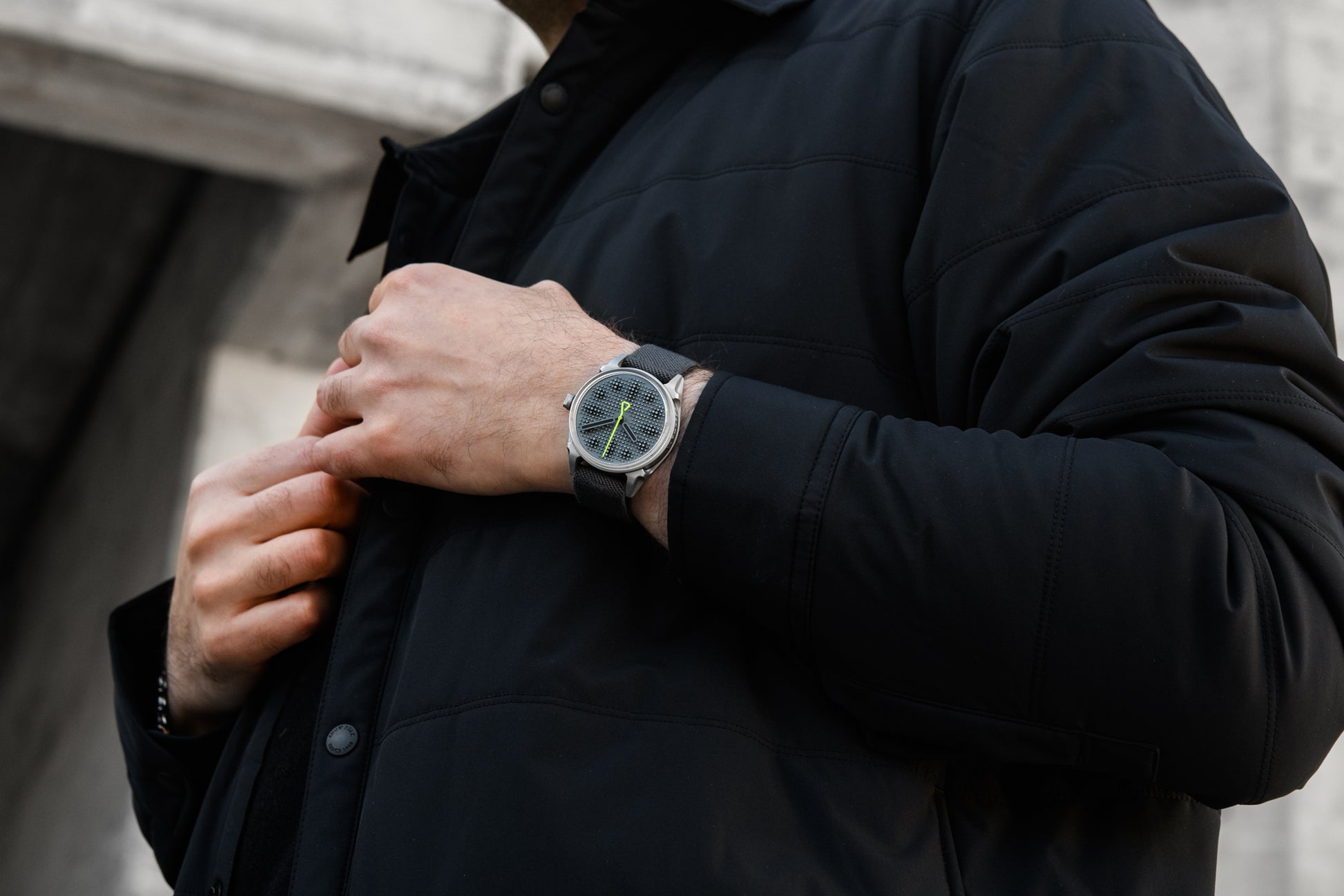The most brutalist iteration of Projekt 01. After the initial three variants featured black dials with different second hands and lume emission colors, it was time to go deeper and darker. Variant E1 features a subtle contrast between the grey dial with blue emission Super-LumiNova and black applied pins. The E1 version features black hands with grey luminescent outlines and a fluorescent yellow seconds hand. E1 and E2 are limited to 499 pieces in total.