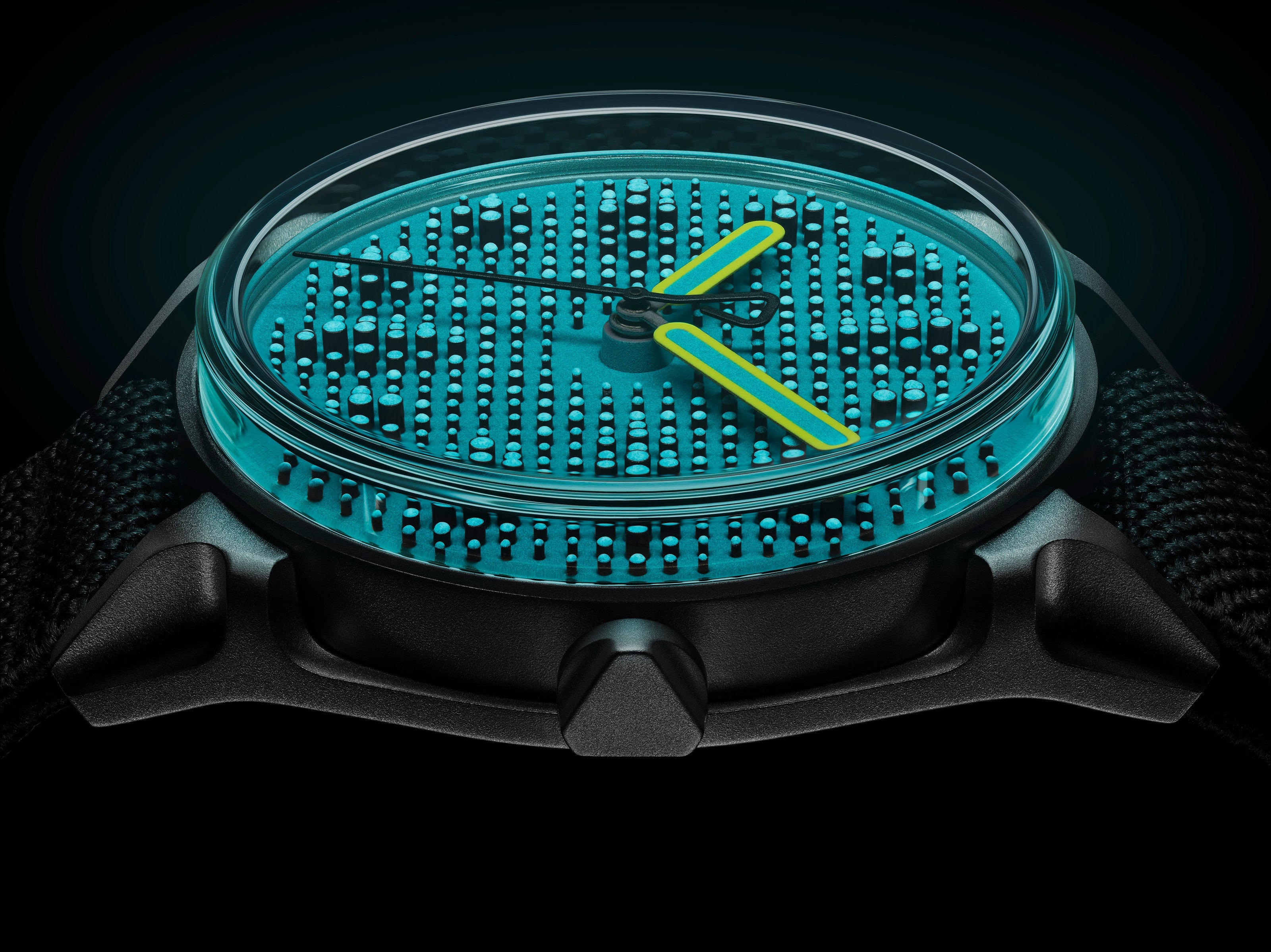 A work of transhumanism. Lo-fi yet three-dimensional. Is it one of those pin art boards from the 80s? A graphical representation of a ripple? A miniature cityscape? The dial is actually a 3D reconstruction of an intentionally pixelated image rendered by Adobe Illustrator. If you squint your eyes, you can clearly make out 12 “maxi” hour markers, with batons for the cardinal hours and circles for the others.