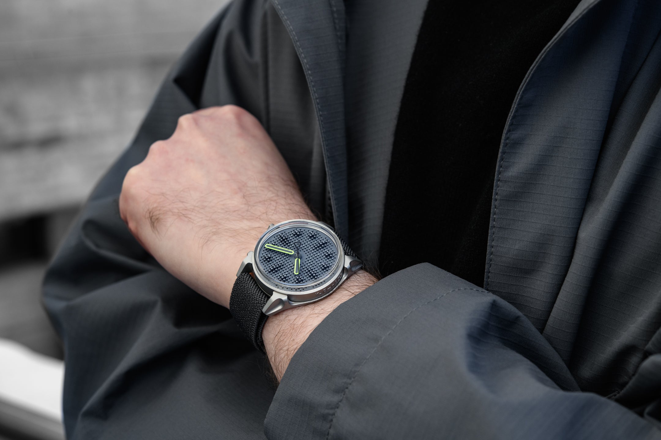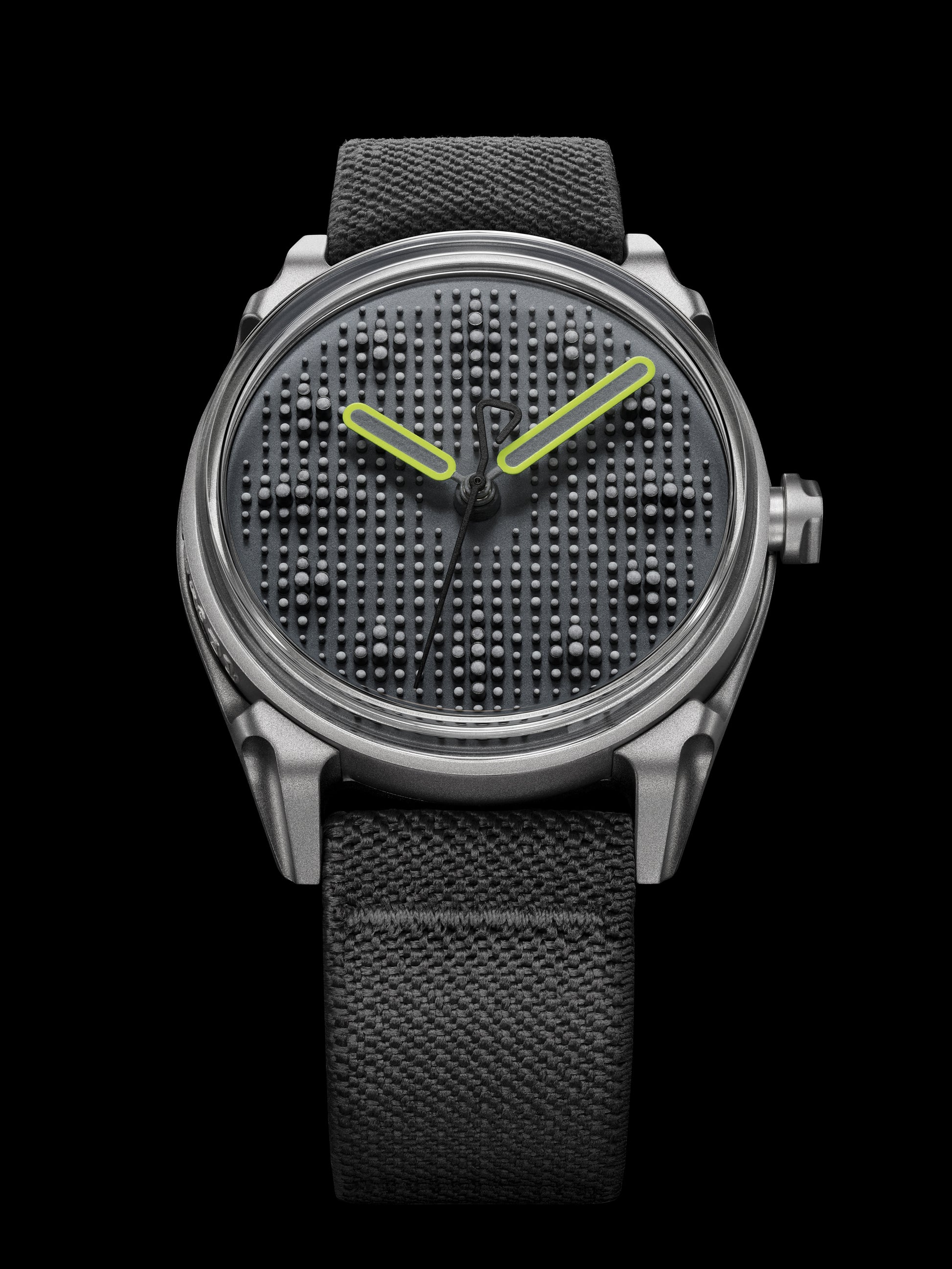 Without trying hard to be outlandish for edginess’ sake, the case is literally crafted like no other watch out there. Forged from 316L stainless steel, the case is not made using typical milling and machining processes at all, though the process is in fact industrial and rather old-school: die casting steel. Why? Well, because they said it couldn’t be done. And because the desired result was one where the case would boast practically no finishing or embellishment, and instead feature a uniform, industrial heavy duty steel tool-like appearance with a specific texture that can only be produced when injecting molten steel into a cast form. It’s neither matte nor frosty, but somewhere in between. And as rough as it looks, it’s unexpectedly soft to the touch. Because of the die-casting process, the edges and angles are slightly rounded off, while the steel has a surface that is neither entirely matte nor sparkly.