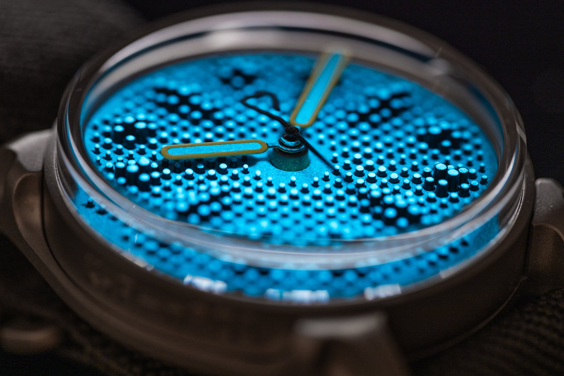 Set with 468 individually hand-applied cylindrical hour markers (is that a world record?), which come in six different diameters and heights. Each of these cylinders is sandblasted then treated with black PVD, then filled with grey paint with Super-LumiNova that glows with a blue emission.
