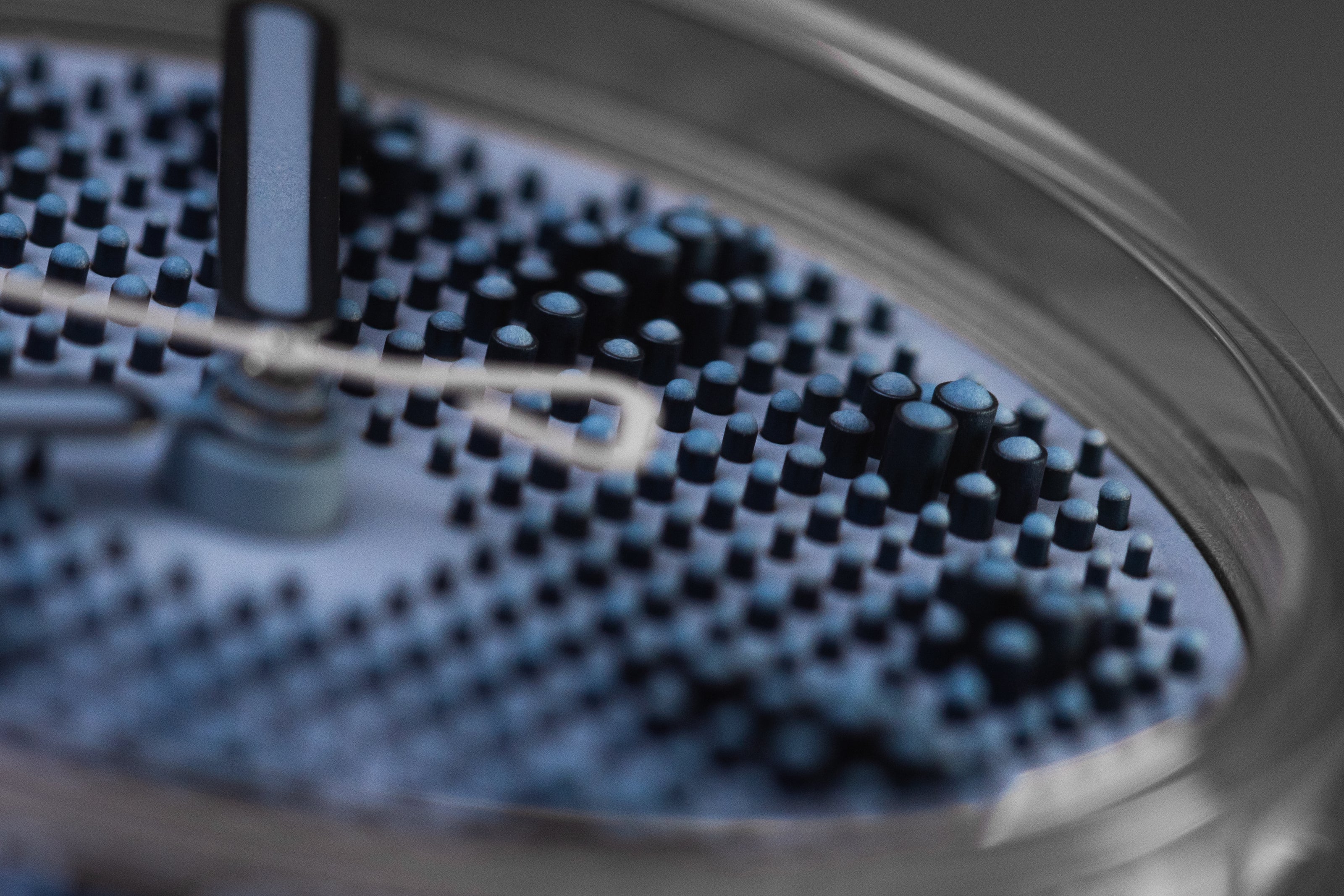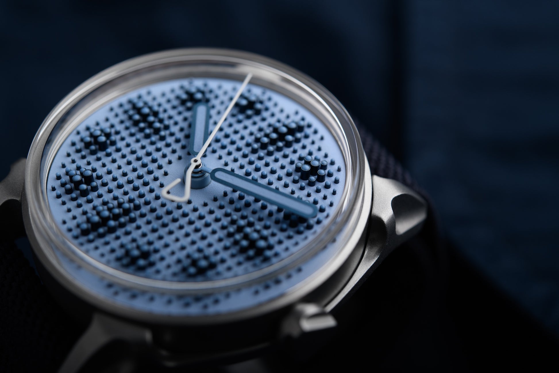 The inimitable kollokium Projekt 01’s studded dial returns in an all-new execution, which we dare say is the tamest to date – and intendedly so. Out of science fiction dreamscapes and into the real world, Projekt 01 Variant G brings a new, softer palette in shades of blue that gives the highly graphical and three-dimensional design a new edge. Variant G1 features blue PVD hour and minute hands with blue Super-LumiNova center and white seconds hand.