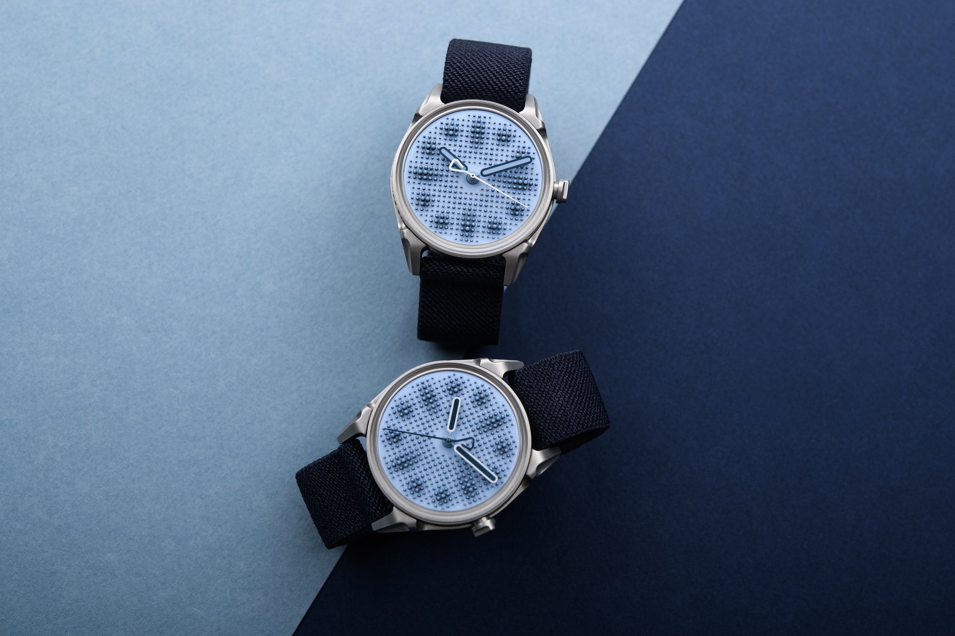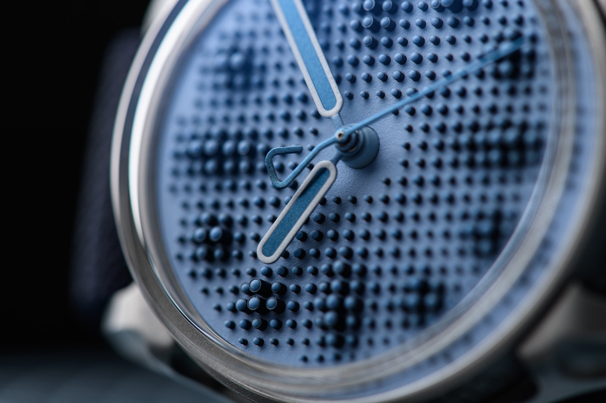 The inimitable kollokium Projekt 01’s studded dial returns in an all-new execution, which we dare say is the tamest to date – and intendedly so. Out of science fiction dreamscapes and into the real world, Projekt 01 Variant G brings a new, softer palette in shades of blue that gives the highly graphical and three-dimensional design a new edge. Variant G2 features white hour and minute hands with blue PVD center and blue PVD seconds hand.