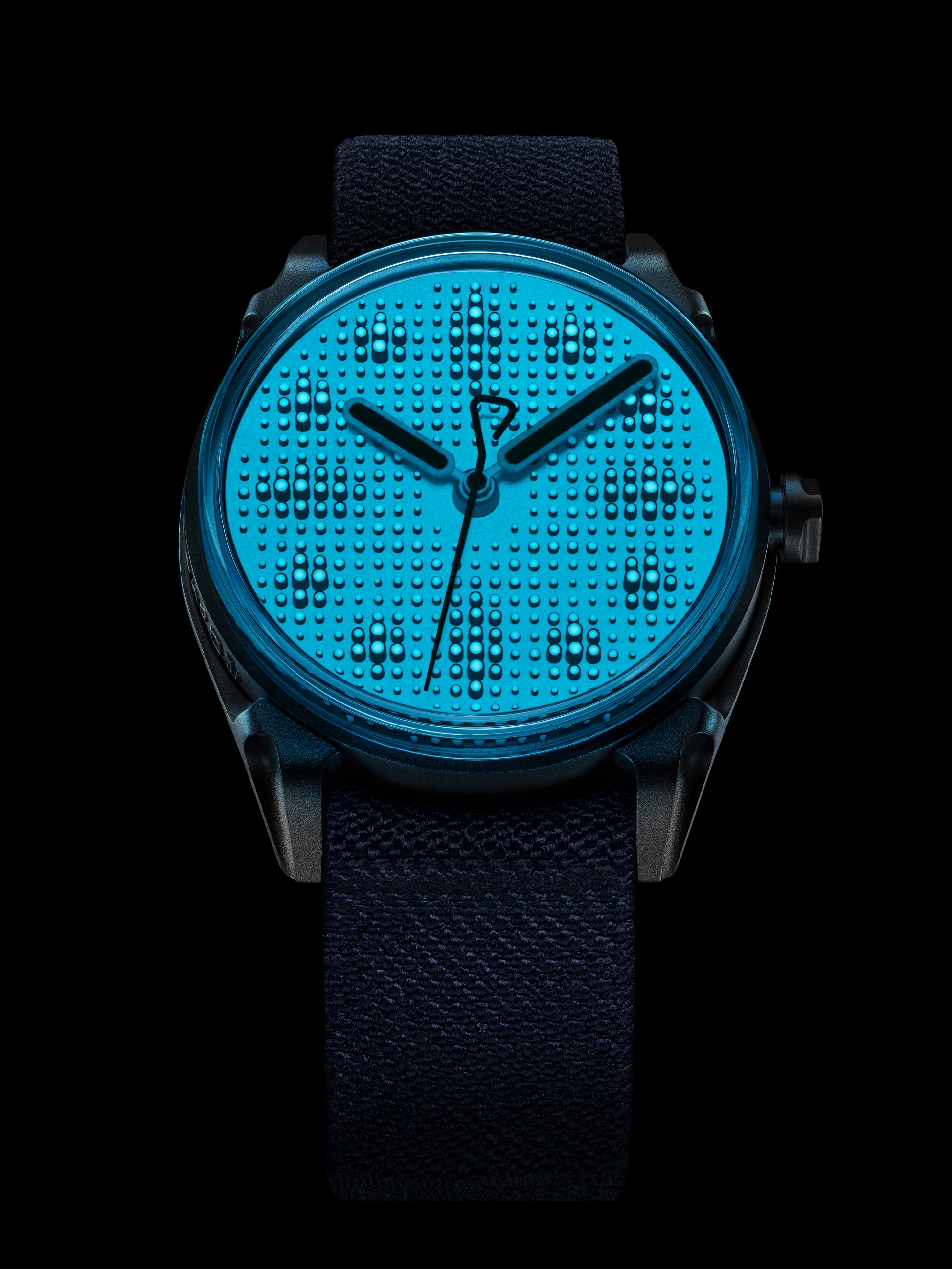 - 468 applied cylindrical markers in blue PVD with hand-painted Super-LumiNova (blue emission) on the tips