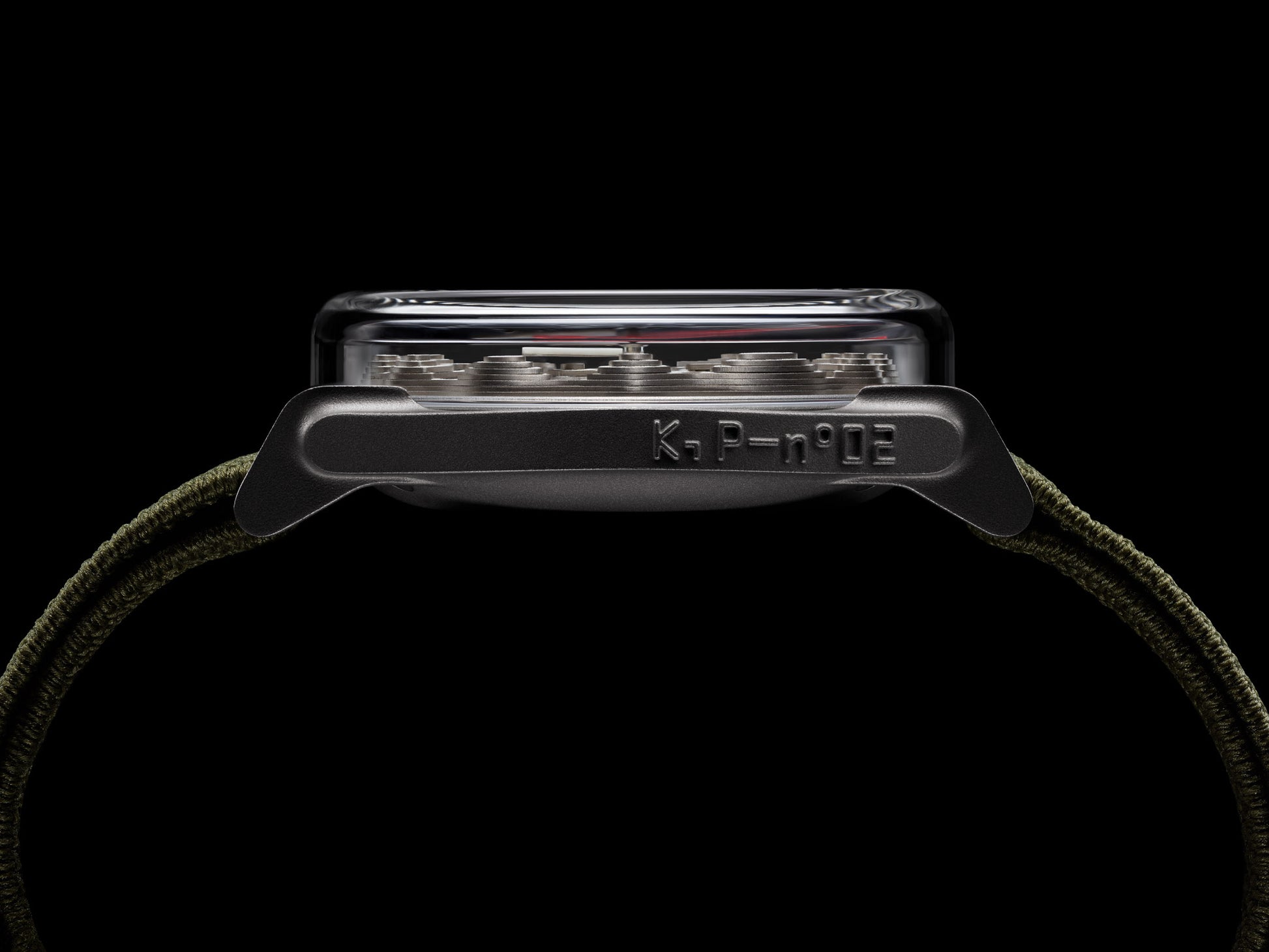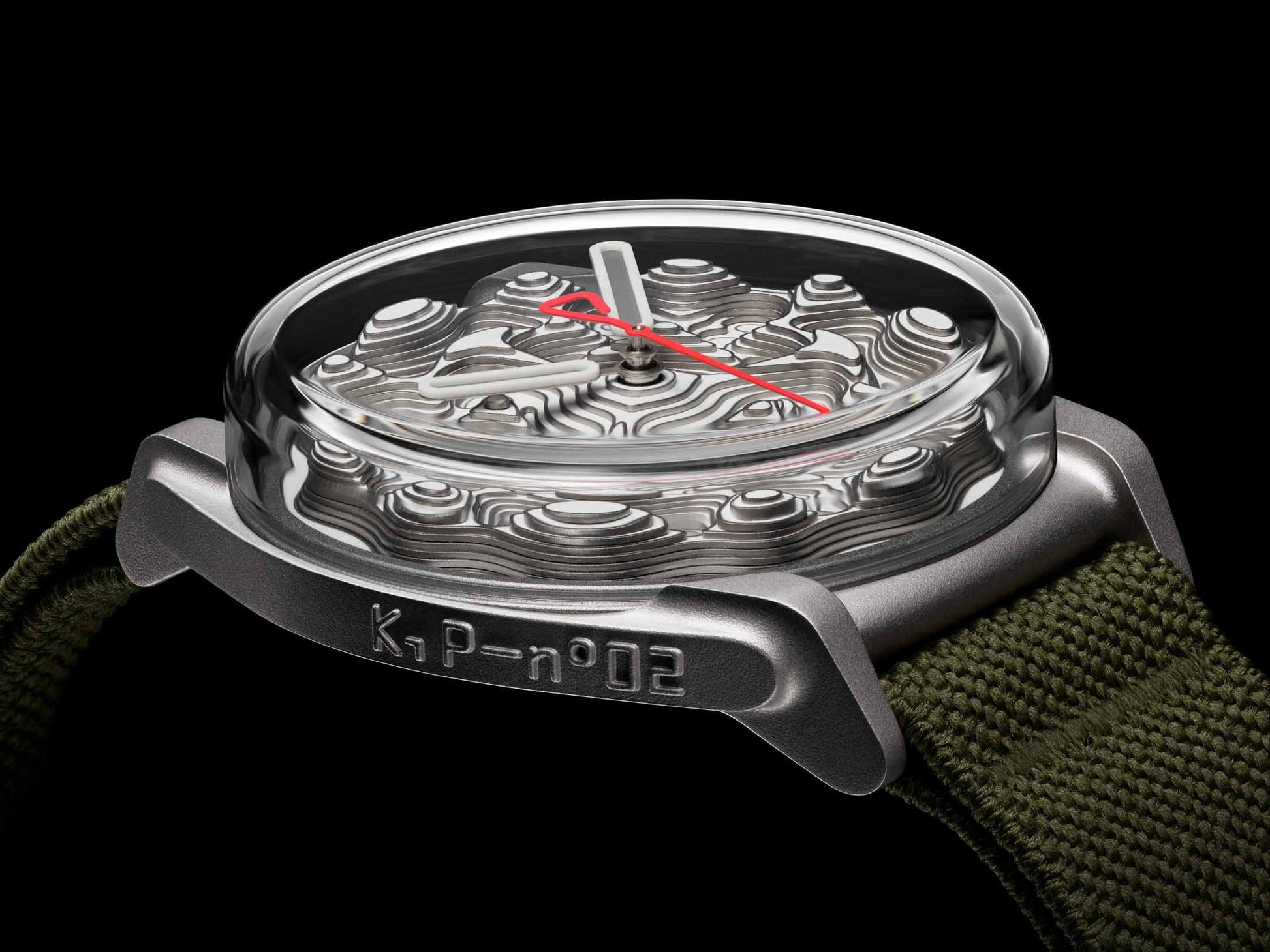 In Projekt 02, the case serves as a structural platform, upon which the topographical dial is built. With no distinct bezel (from the outside anyways), no caseback and no detachable lugs, it’s a single integrated unit that’s indivisible. The design is such that a slightly arched barrel-shaped central element appears to be held in place by four triangular lugs, as if welded together. No sharp angles, no straight lines. It’s all in the curves and tension. With a rounded bottom and downward lugs, the case sits very close to the wrist and wears surprisingly slim. With no visible logo or branding, the watch bears only one mark of its makers: the project’s full internal dossier or project name, K,P–n°02, in relief on the side of the case. On the opposite side, the signature kollokium triangular valve-shaped crown.