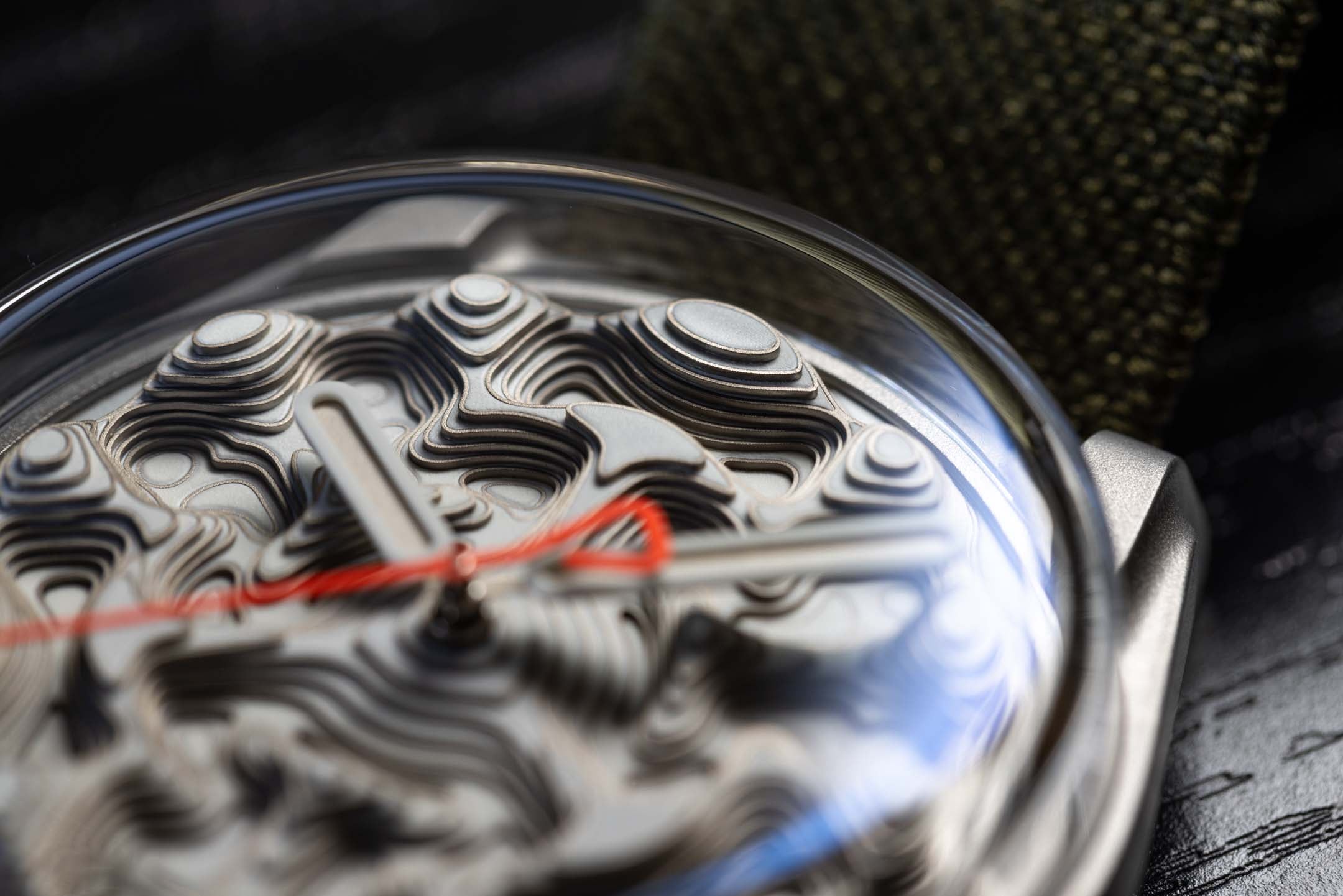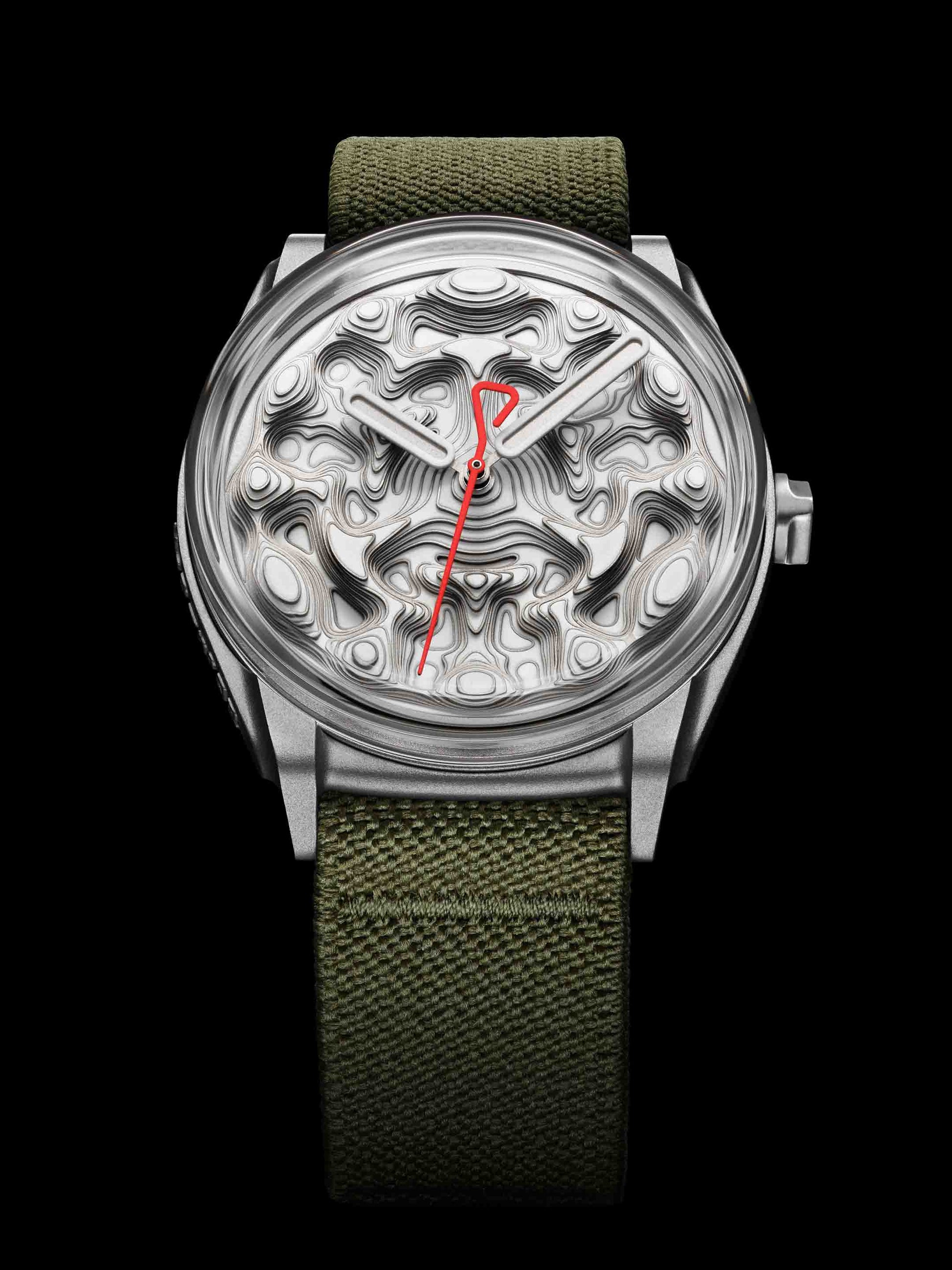 Simply enough, Projekt 02’s dial began as a flat image with an organic pattern. Curving, meandering, circling but never sharp. The image was then broken down so that contours would be created around the different undulating forms. Those contours were then transfigured into different layers in different heights, producing a micro-landscape across multiple levels. While seemingly random, the dial in fact features twelve hour markers and has a certain logic and pattern, with three equal parts making up the circle.